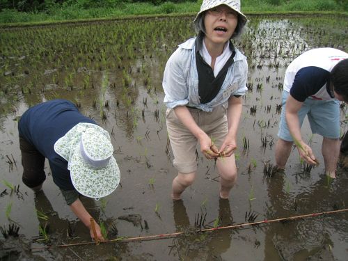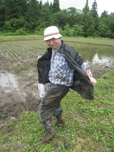 6月6日(土)7日(日)と飯山で今年も田植えをしてきました。 本来なら先週の【6月8日号】でお伝えすべきなのですが… 日曜日の帰宅が遅くなった場合は、 その日の模様を月曜未明(すなわち日曜日の就寝前)にアップするのは厳しいのです。 ま〜簡単な日記やブログ程度の短かい文章だけなら書くことも出来ますが 私自身も一週間に1回のコラムを書く事が楽しみであることと よせばいいのに写真をけっこうたくさん撮っていて それを選んで画素数を落として写真をアップするのも、それなりに時間がかかるのです(^_^;) それに週3回のブログとも日曜の夜は重なって大変なのです。 大変なのです…と言っても誰に強要されているわけでなく私が勝手に書いていることで 当然YUKIからも同情される事もありません(^_^;) てなわけで一週間遅れで飯山での田植えの模様をお伝えしようと思うのですが… ブログの方で3回連続で… ●私が飯山に魅かれる理由 ●私が飯山に魅かれる理由〜その2 ●私が飯山に魅かれる理由〜その3 を書いてしまいました。 今回で5回目の訪問になる飯山ですが、とんでもないドジをしてしまいました。 いつもの事ですが前日は1時間ほどの睡眠で6日土曜日は午前5時に起床し出発の準備をしました。 雨が降る中、クルマに荷物を積んだり、ゴミを捨てにいったり 我が家とクルマの間を何度か慌しく往復したあと、出発しました。 飯山の森の家に到着し、靴を脱ごうとした時、私は思わず声を上げてしまいました! 「靴が片方違ってる!」…と(^_^;) 我が家を出る前に、寝ぼけたアタマで何度かクルマと家を往復し、 薄暗い玄関で靴を履き違えてしまったようです。 とりあえずは、田植えですから持参した長靴があればどうにかなります(^_^;) でも、それ以外代わりの靴はありません。 田植えが終れば、夕方からバスで温泉に行って汗と汚れを落として、 それから村の集会場で、村の人たちとの交流会の宴があります。 そこでは当然、靴を脱がなくてはなりませんが、長靴のままでいくしかありません。 実は昨年、私はこの集会場での交流会で、これまた靴に係わるドジをしているのです。 宴が終るとバスで宿まで帰るのですが、最後の一人が中々バスに戻ってきません。 やがて係員がバスに乗り込んで来て、我われバスの乗員に向かってこういいました。 「みなさま、今履かれている靴をご確認下さい、ご自身の靴でしょうか?」 自分の足元を見ると、どうも自分の靴ではないようなのです(^_^;) 私は恐る恐る手を上げると、皆は大笑い、私は急いでバスを降りて集会場の入り口の下駄箱に 向かうと、私の靴はちゃんとそこに残されていました。 私は靴の持ち主に最敬礼をし、二人でバスに戻った時は大きな拍手に迎えられ すっかり酔いが醒めてしまいました(^_^;) そんなことがあって、また今回もとなると、私はまるでバカのように思われます。 YUKIはとっくに「まるでバカ!」と言っていますし、 こんな事をココで書いてしっまったら…やっぱりバカですね(^_^;) なにしろ、この時点で私の少ない脳みそで考えたのは さりげなく長靴を履いてやり過ごすということです。 ズボンの裾をおろしてしまえば長靴はそれほど目立たないものですが、 団体行動で脱いだり履いたりする時はけっこう大変ですし 下駄箱におくととても目だってしまうのです(^_^;) 定宿の森の家は宿泊のロッジとメインのターミナル・ハウスとは パソコンの無線ランの関係上からも何度も行き来をする事になるのですが そのたびに靴をイヤ長靴を脱いだり履いたりしなければならないのです(^_^;) 田んぼでの農作業で長靴もどろだらけになってフル活動し… |